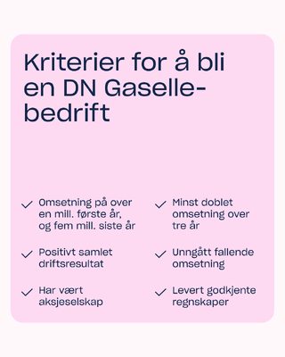 Å bli en gasellebedrift innebærer at man har oppfylt krav som: godkjente regnskaper, positivt samlet driftsresultat, unngått fallende omsetning – og minst doblet omsetningen over fireårsperioden.