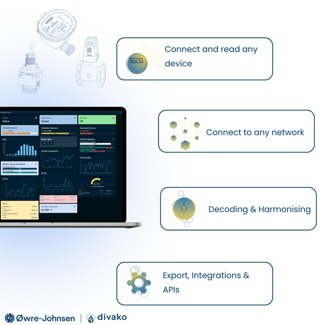 - Harmoniserte data: Programvaren leser og standardiserer data fra enhver måler eller enhet med åpen protokoll, uavhengig av produsent.